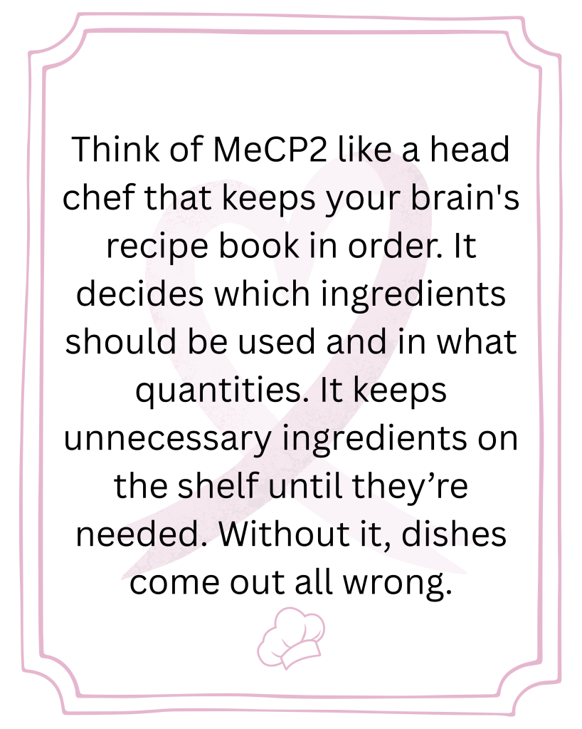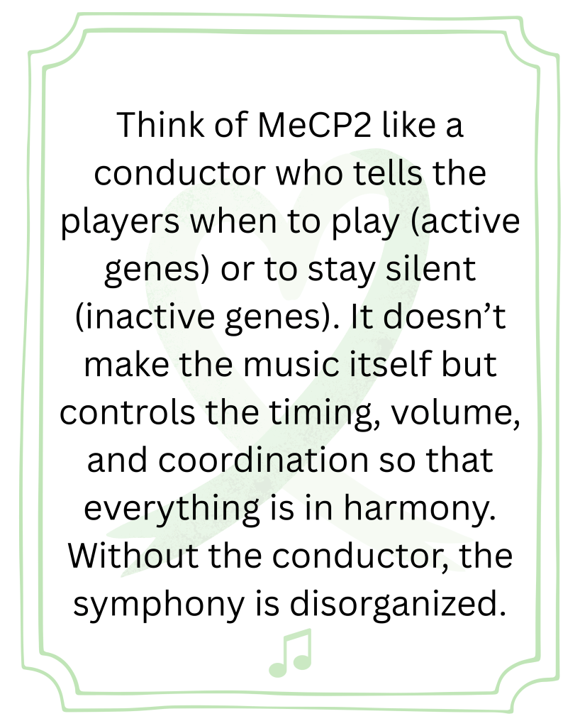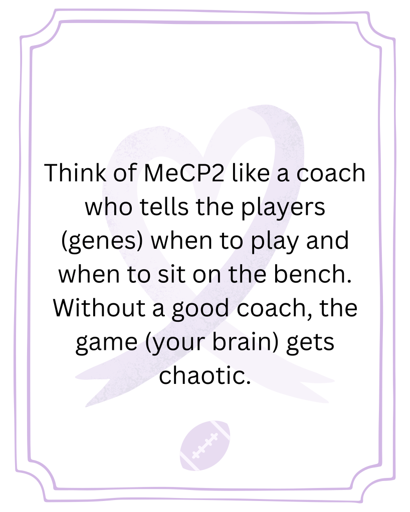 This mutation prevents the gene from producing a very important protein for brain function. Think of MeCP2 like a coach who tells the players (genes) when to play and when to sit on the bench. Without a good coach, even though all the players are still there, the game (your brain) gets chaotic.